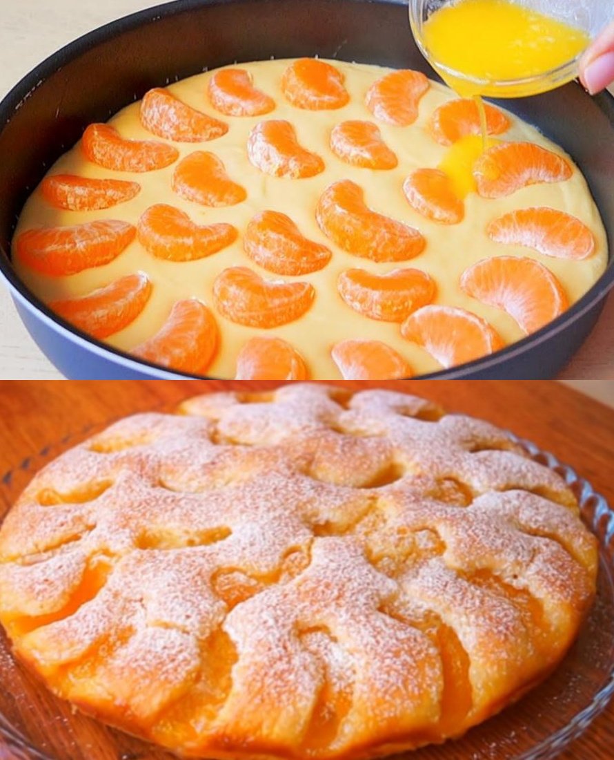 I pour the finished mixture into a mold and level it. Next comes the most enjoyable part – I arrange the tangerine slices on top so that they form a beautiful pattern. I drizzle with melted butter and sprinkle with sugar.